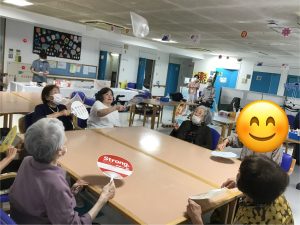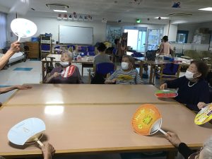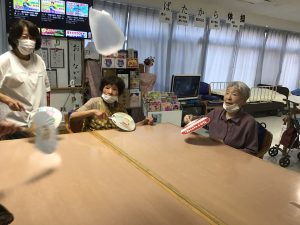 うちわをあおいで風船を操り、ポイントを狙っています💨🎈自分のところに来た風船を必死に動かそうとする事で自然に体が動き、いい運動にもなりますね💪